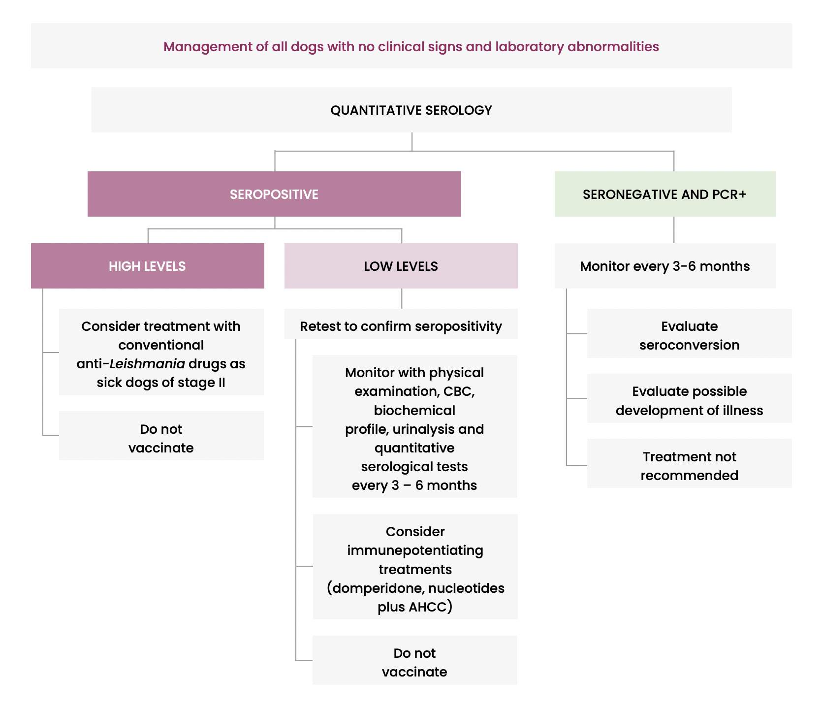 It is recommended to use serology alone or the combination of serology with PCR for screening healthy dogs and to avoid screening clinically healthy dogs (not vaccinated) only by PCR.